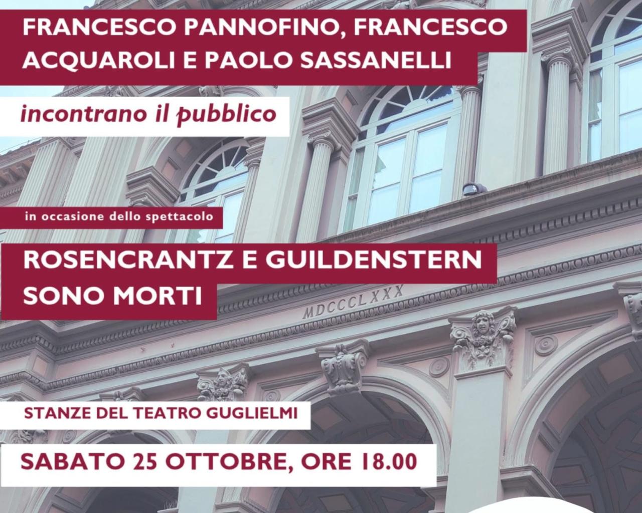 Sabato 25 ottobre alle ore 18, presso le Stanze del Teatro Guglielmi, Francesco Pannofino, Francesco Acquaroli e Paolo Sassanelli incontrano il pubblico in occasione dello spettacolo "Rosencrantz e Guildenstern sono morti".